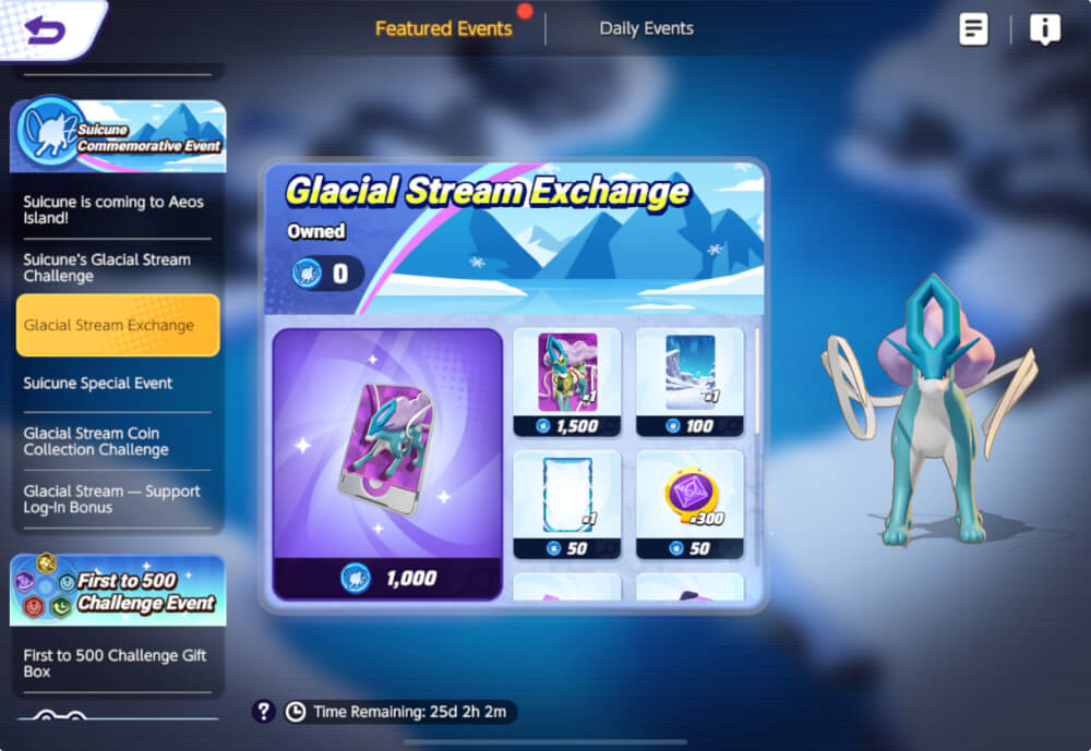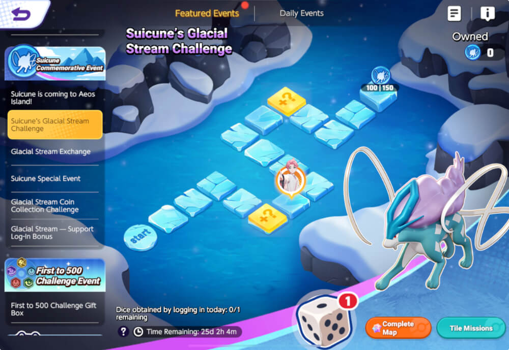 Getting to the end of the board awards glacial stream coins that can be redeemed for various prizes, including the aforementioned Suicune License and Holowear. It may be difficult for free-to-play players to earn both the License and Holowear. It is recommended that you use Aeos coins to re-roll the dice to always move the maximum spaces, six. You can re-roll up to five times and you will always get a higher number than you had unless you roll a six.