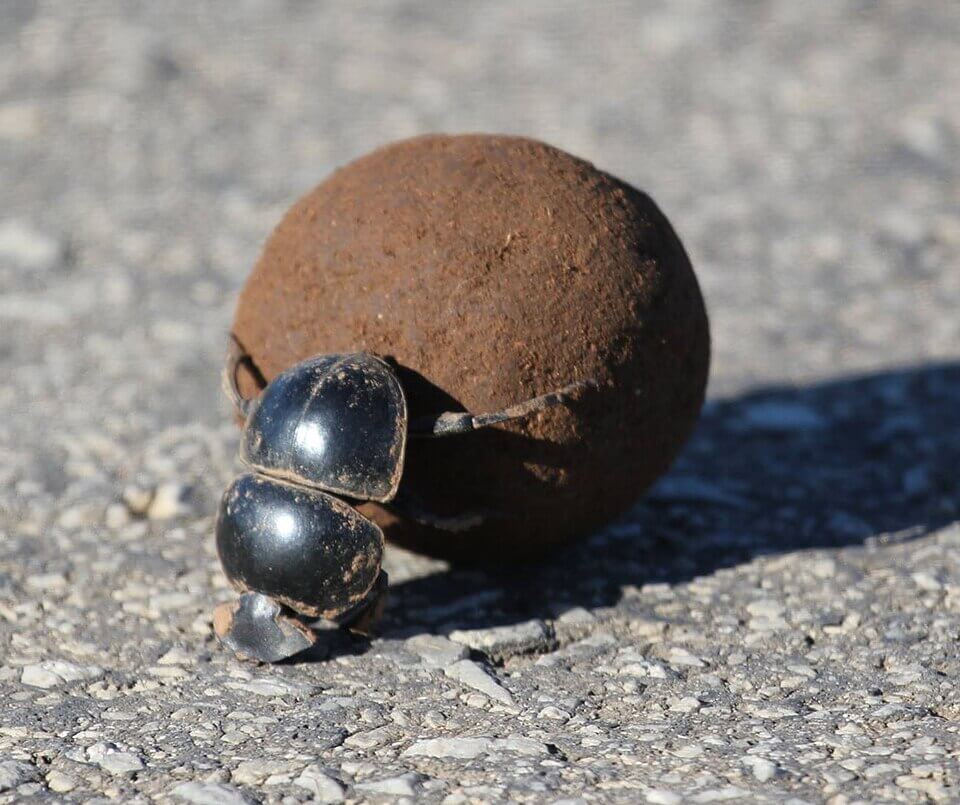 Dung beetles can be classified into three subgroups: rollers, tunnelers, and dwellers. A roller will collect dung and push it around, forming a ball. It is often found standing on its head and using its hind legs to help shape it into a smooth sphere. These balls will be used as a food source. When they find a mate, they will roll the ball together until they are ready to lay eggs. They’ll bury their sphere and lay the eggs inside it.