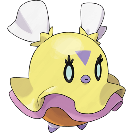 This cute Psychic-type chick Pokémon has a name that combines “flitter” and “little”. It is covered in several layers of frills that sway back and forth while it floats in the air.