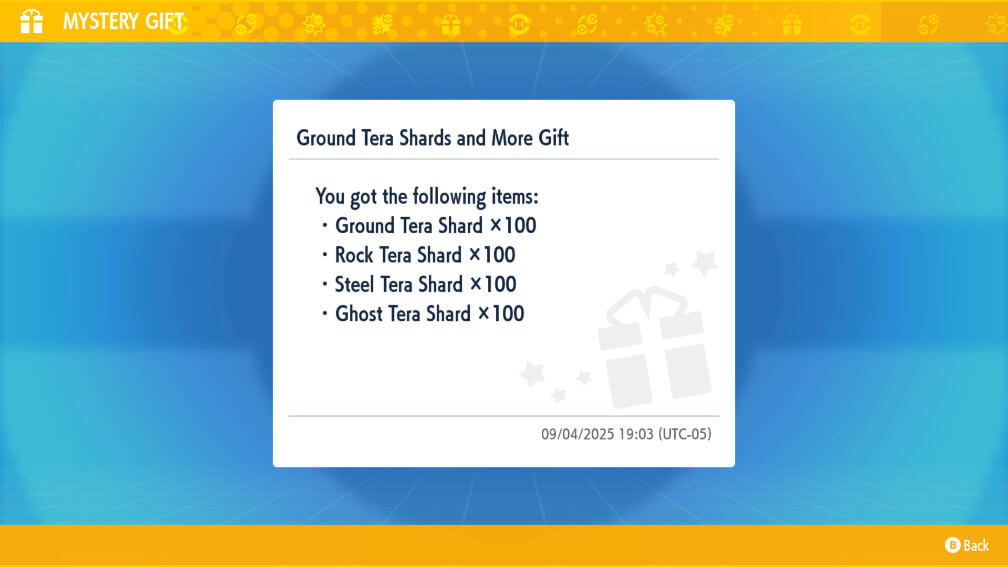 There is no code necessary to redeem this Mystery Gift but Shiny Ting-Lu and the Tera Shards will expire on September 30, 2025, at 6:59 p.m. Central Time, so claim them before you forget!