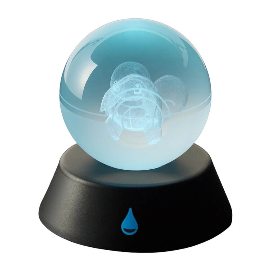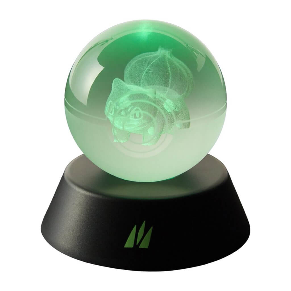 - Set of three translucent Poké Balls with an internal etching of Bulbasaur, Charmander and Squirtle on illuminating bases and a case for the set