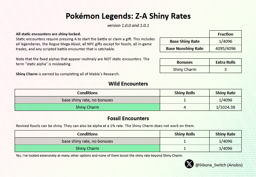 Each time a Pokémon spawns in the game, there’s an internal “roll” on whether or not the Pokémon will be Shiny. That base rate is 1 in 4096 for a Pokémon to be Shiny, or 0.02%. If a player has the Shiny Charm, obtained from Mable’s Research rewards, three additional rolls will be performed for a total of four, bringing the odds to 1 in 1024.38, or 0.0976%.