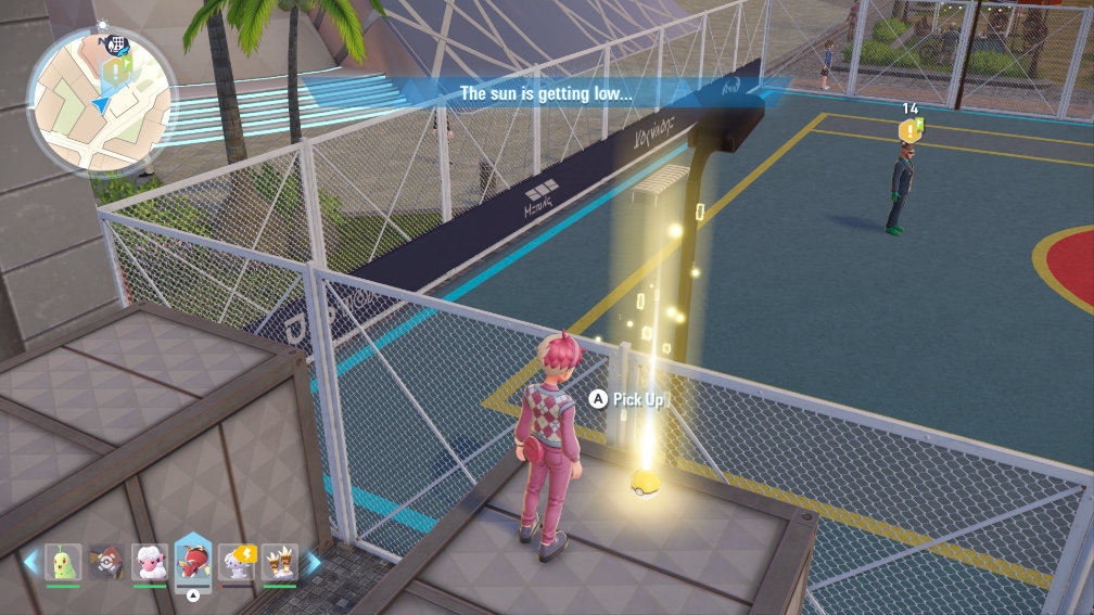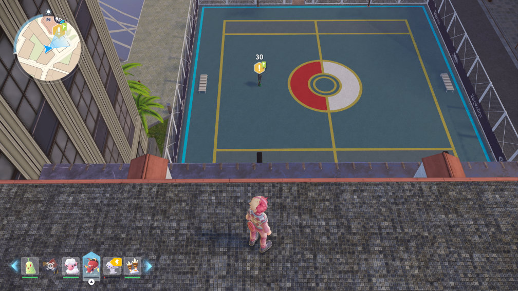 Find a TM Item Ball in the court south of Quasartico, Inc. in the Magenta District. Requires dropping down from the roof above. When facing the court, dodge off the roof aiming at the left light pole.