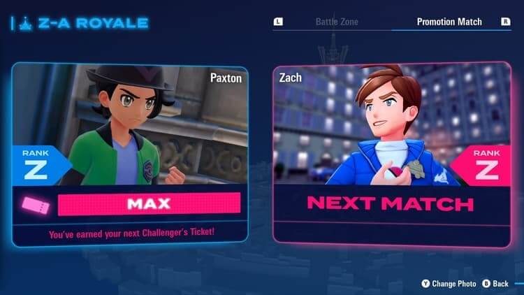 Climbing up the ranks of the Z-A Royale is done by beating Promotion Matches, which require a Challenger’s Ticket to take on. Challenger’s Tickets can be earned by beating trainers in battle zones to earn Ticket Points.